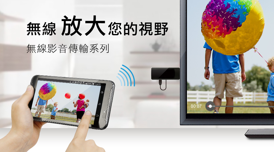 | 透过无线影音传输器让您轻松的将手机、平板、计算机的画面传输至大屏幕(可投放于电视屏幕、计算机屏幕、投影机)。 |