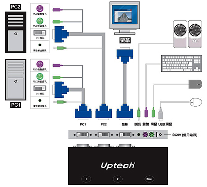 使用一組DVI屏幕、PS2鍵盤、PS2鼠標與喇叭,控制切換兩台計算機。 |