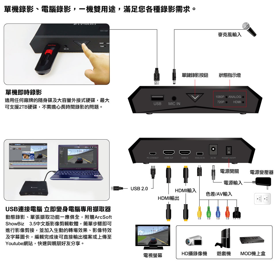 | • | 提供HDMI、色差、AV端子输入,可连接家中的影像播放设备,并转录为数字档案储存。 |