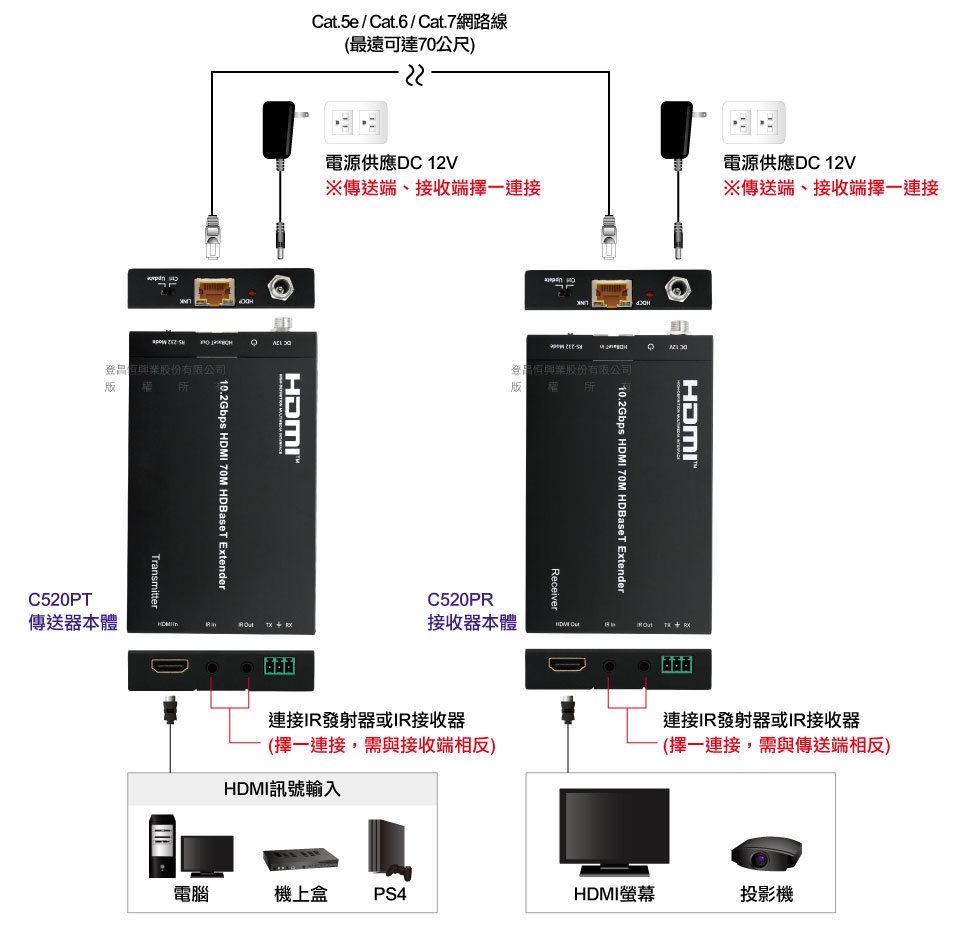 使用一条Cat.5e以上网络线将传送器与接收器连接,即可将HDMI及IR讯号延长,最远可至70公尺。 |