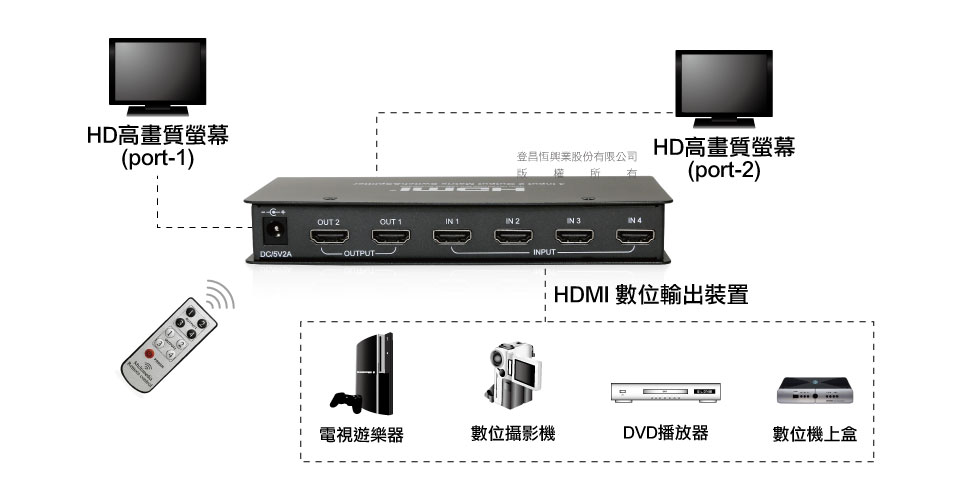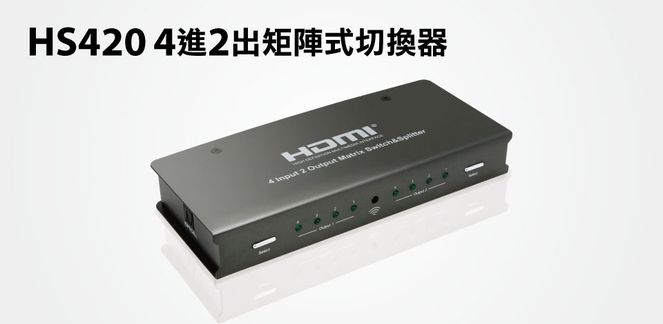 这一款 HDMI 讯号切换分配器,可切换4 组不同的 HDMI 讯号并同步输出至 2 台显示器上,使用面板按键或遥控器进行切换,支持输出分辨率达 1920x1080@60hz。