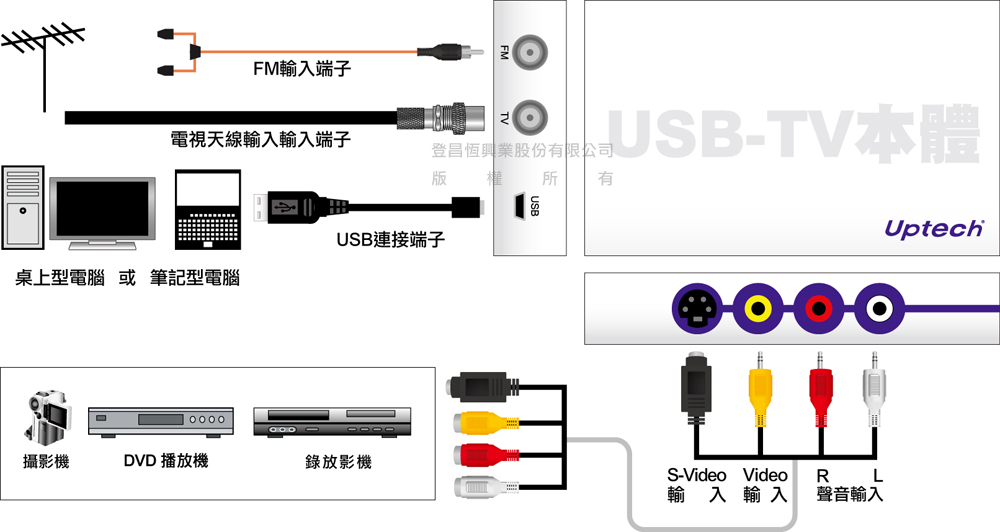 内建1组电视输入、1组FM广播输入、1组Video影像输入、1组S-Video影像输入及1组RCA(立体声)声音输入等多种模拟讯号输入端子。 |