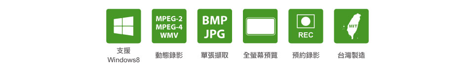 提供动态影像MPEG-2、MPEG-4及 WMV 实时录像格式,分辨率 720×480 。 |