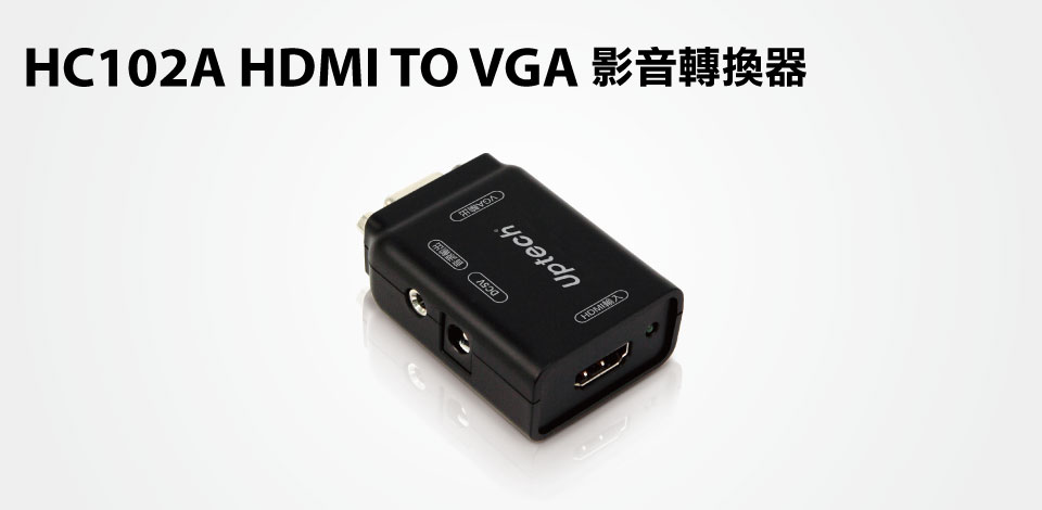 | HC102A可连接笔记型计算机、Ultrabook、平板计算机,或其它具有HDMI输出端子的设备,将HDMI数字讯号转换为VGA端子+立体声输出,轻松的将影音画面显示在屏幕或投影机上。 |