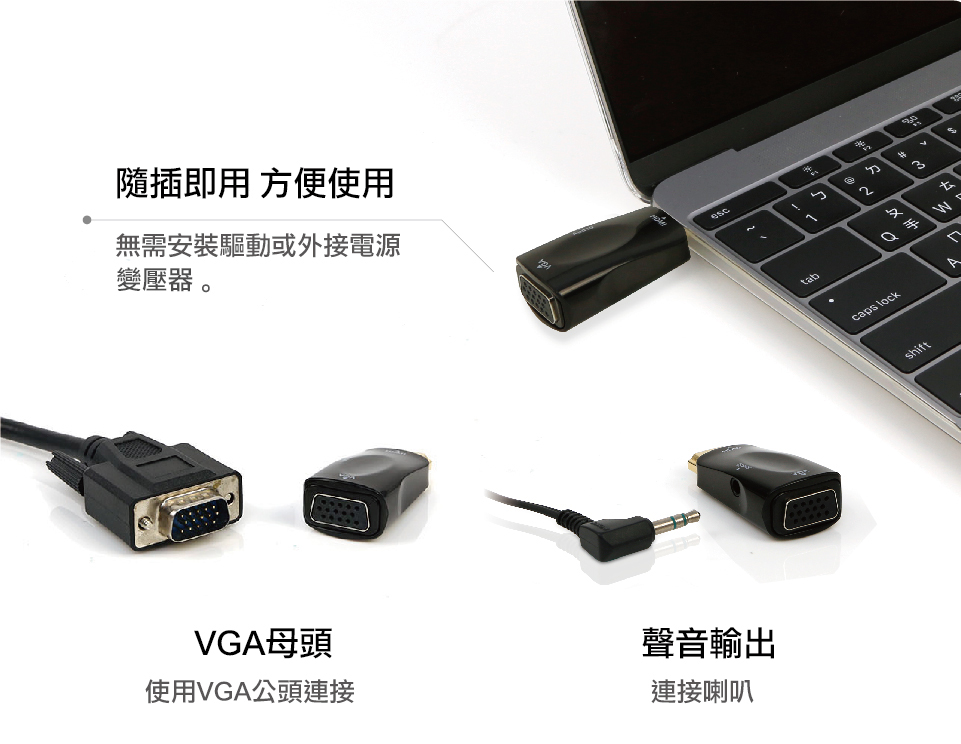 可将HDMI数字讯号转换为VGA端子+立体声输出 |