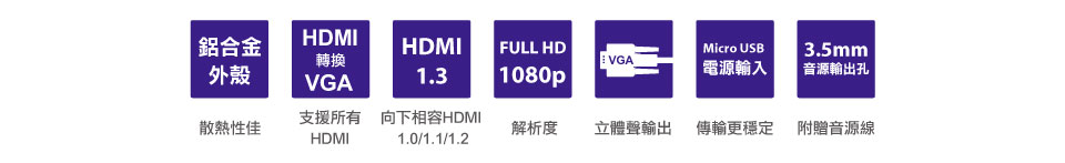 可将HDMI数字讯号转换为VGA端子+立体声输出 |