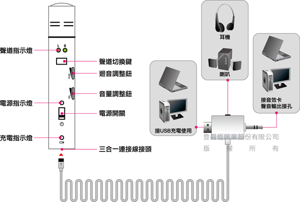 当电量不足时,请将『三合一连接线』的 USB 接头连接至计算机的 USB 连接端口上,并将将『三合一连接线』的混音麦克风接头,接上『混音麦克风』底端接孔(计算机必须在开机状态下)。 |
