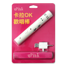 | 将『三合一连接线』的混音麦克风接头,接上 uPink 卡拉 OK 欢唱棒内附的『混音麦克风』底端接孔。 |