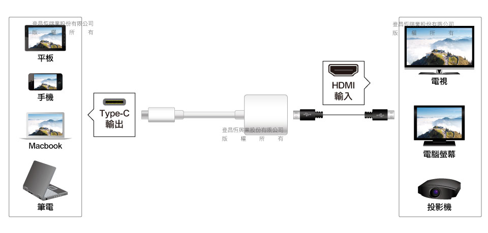 连接具备 Type-C 埠的MacBook、NoteBook、手机、平板…等,将画面镜像或延伸呈现在屏幕、投影机上。