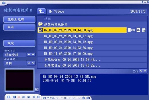 | 22.點主畫面『錄製的電視節目』,可直接做播放、剪接、重新命名、刪除集燒錄光碟的動作。 | ||||