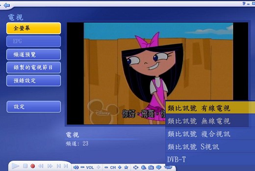 | 17. 進入『電視』選項,進行第一次掃描有線和數位電視的動作後,就會進入這電視的主畫面, 滑鼠點電視畫面兩下可全螢幕觀看,右下方 『TV/AV』按鈕則可選擇訊號來源。 |