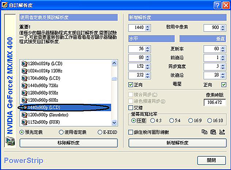 如以上仍無法解決或用其他顯示晶片可找PowerStrip這個螢幕調整軟體來裝,此軟體一樣可調整各種顯示卡的螢幕解析度模式。 PowerStrip官方下載頁面點我 (可下載International版為包含繁體中文的多國語言版) |