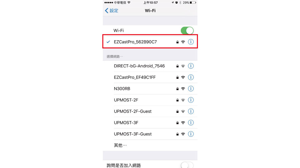 請將EZcast Pro / LP-1697接上電視機並通電後,使用iPhone / iPad,連上EZcast Pro / LP-1697的Wi-Fi熱點 (連線金鑰顯示在電視機上)。