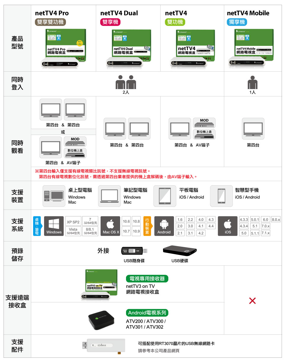 ※ netTV4系列需支援可開啟通訊埠的網路服務才能使用,若搭配社區網路或WiMax網路使用,購買前建議先洽詢網路業者是否可提供開啟通訊埠服務。