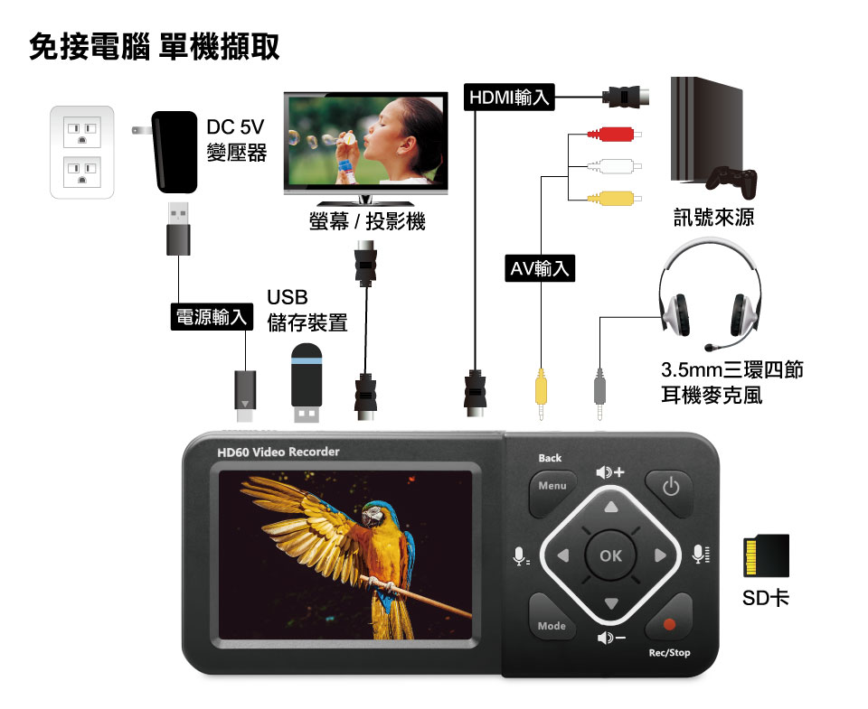 | 支援模式 | 【單機操作】即時擷圖、即時/預約錄影 【電腦模式】軟體擷圖/錄影(連接Micro USB) |