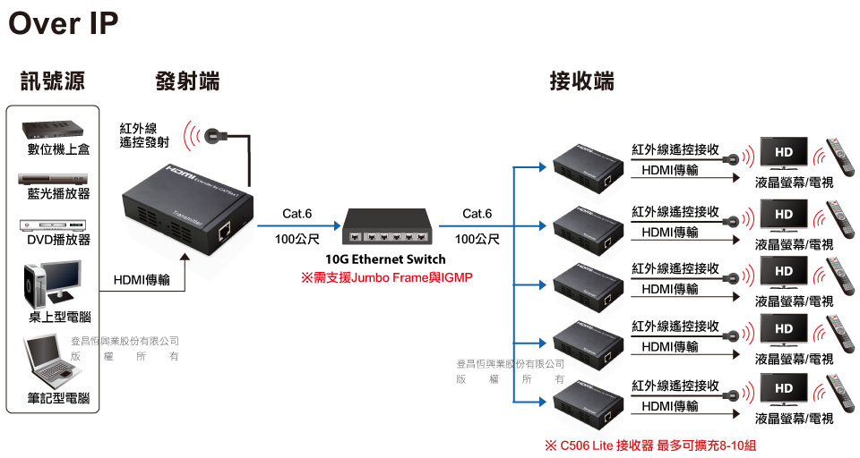 AV over IP解決方案,是一種透過IP網路進行AV傳輸,讓擴展性幾乎無限,提供更低的佈線成本與維護管理工作。