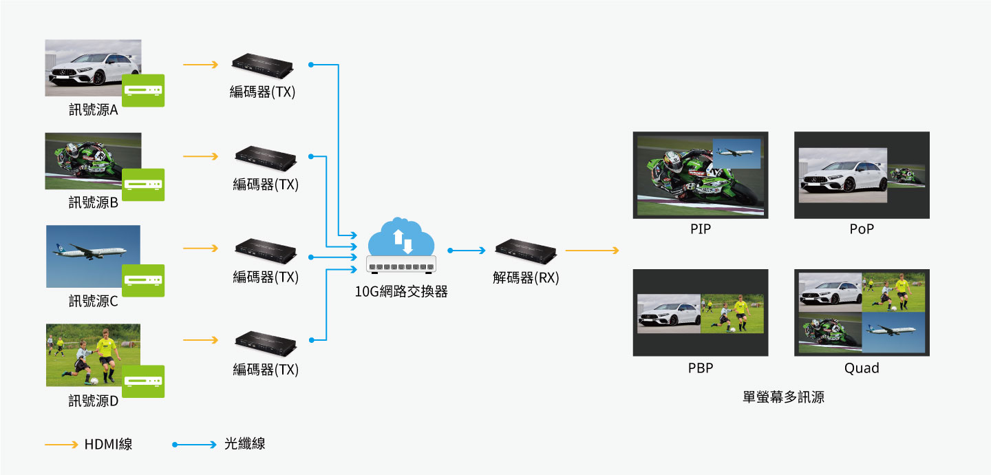 使用光纖線將編碼器(TX)連接至網路交換器,再連接至解碼器(RX),最遠可實現240公里的傳輸距離。
