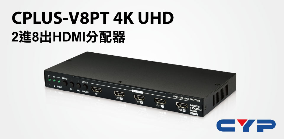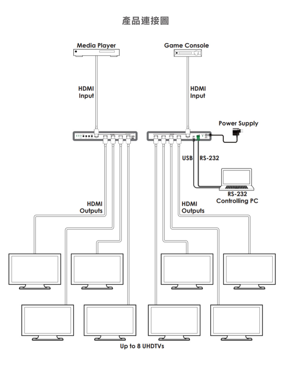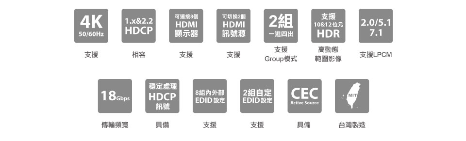 可連接8個HDMI顯示器並切換2個HDMI訊號源,支援最新訊號源自動切換 |