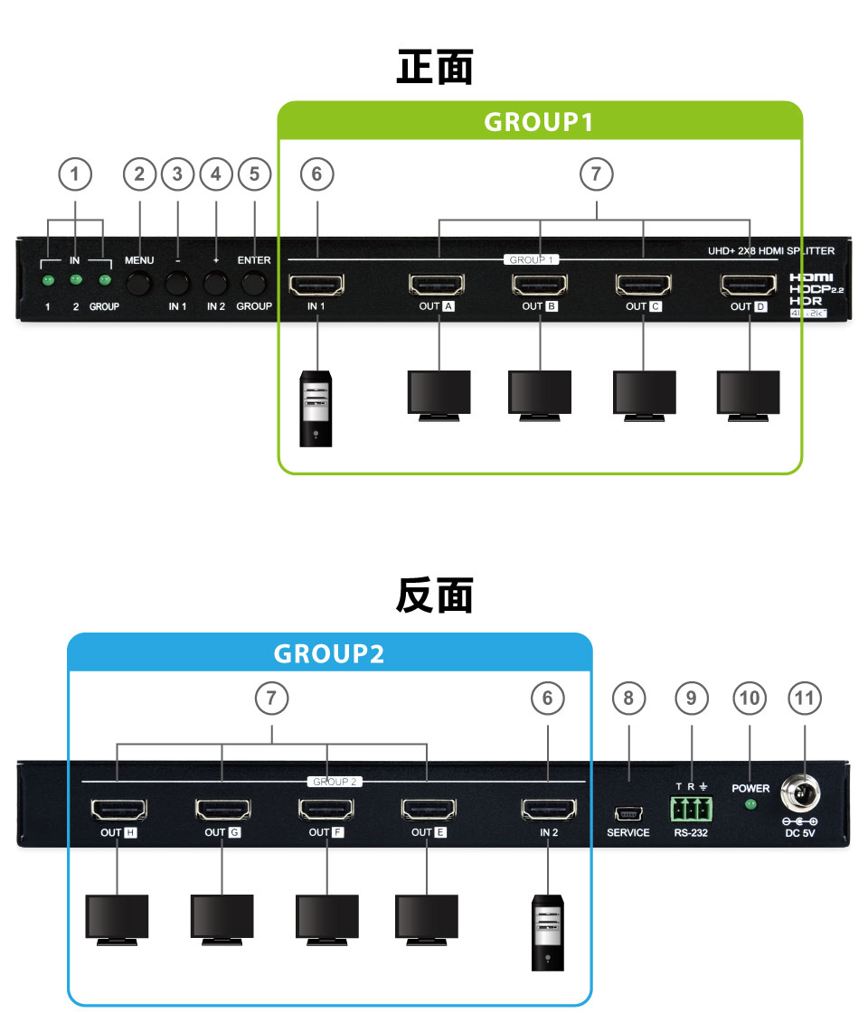 具備Group模式,可輸出2組1進4出的HDMI分配訊號 |