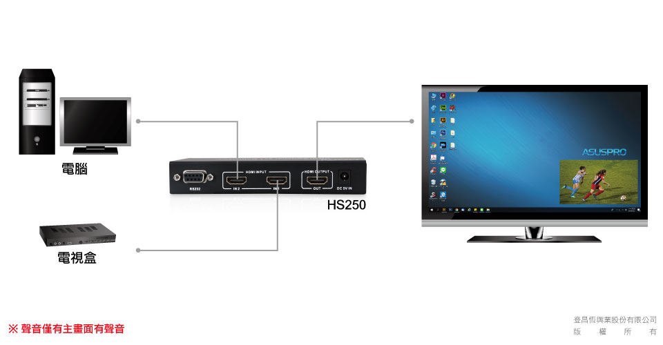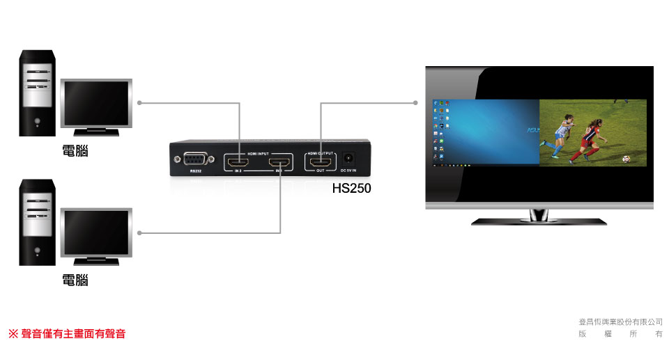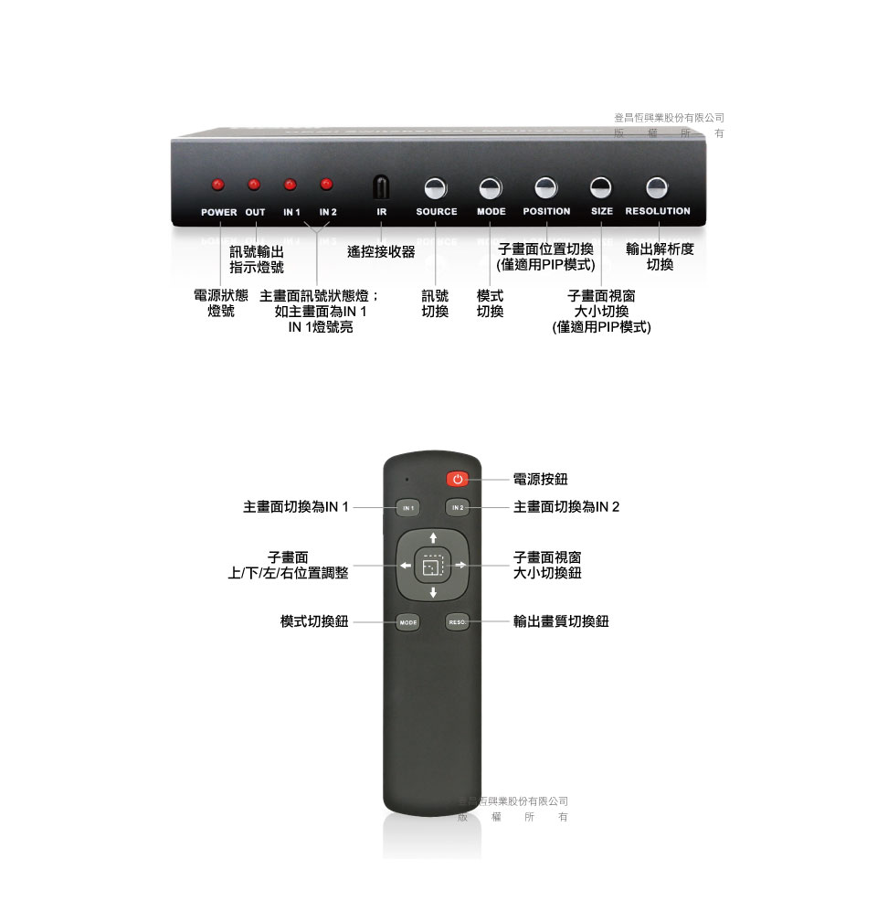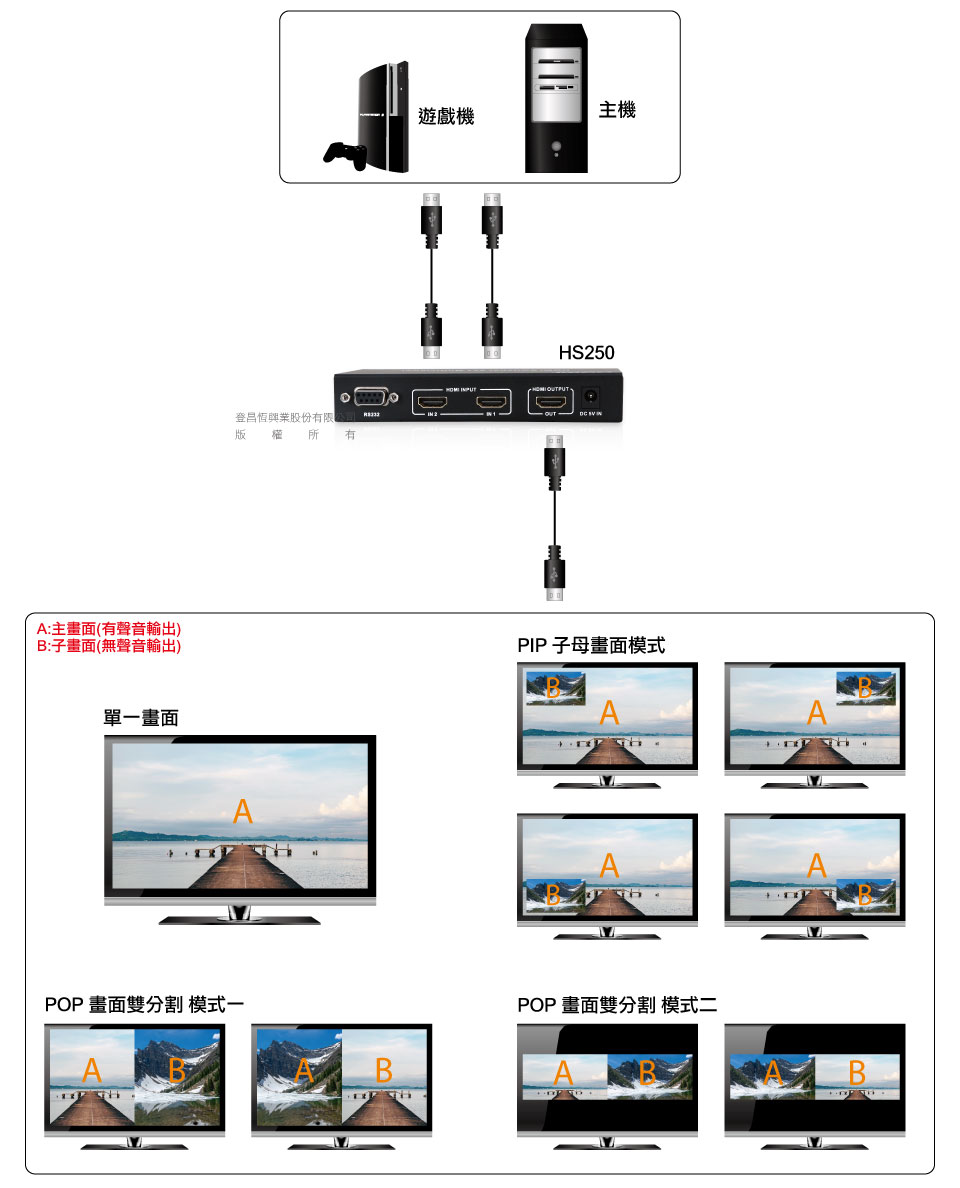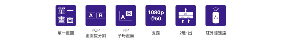 支援2組 HDMI 訊號切換單一畫面、PIP子母畫面或POP雙分割畫面顯示在同一個螢幕上 |