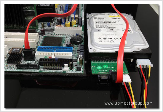 | 4. 將 UTN660連接至硬碟/光碟機的SATA接頭上,之後插入小4pin電源及 IDE排線至本體後方 (硬碟也要接大 4pin 電源 ) 。 |